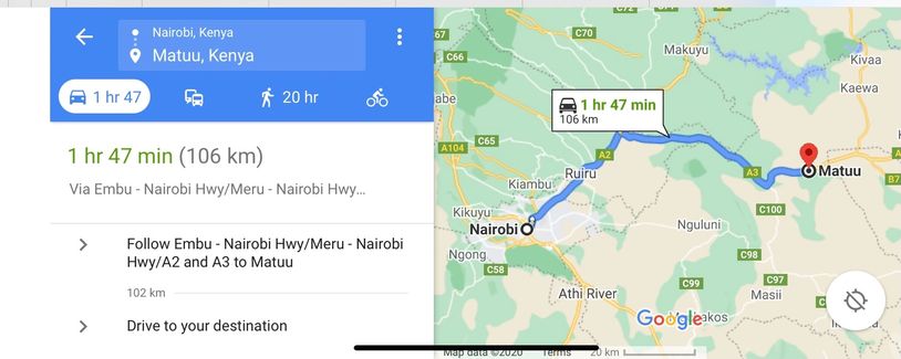 From Nairobi you can either use Thika Super Highway, then Thika-Garissa Highway onwards to reach Matuu or you can use: